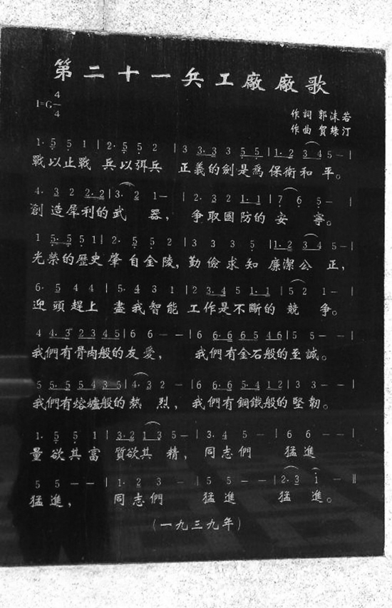 ③《21兵工厂厂歌》创作于1932年,由金陵兵工厂厂长李承干先生邀请他留学日本的同窗好友郭沫若先生作词,并由贺绿汀先生谱曲。