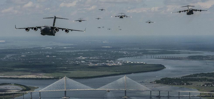 5月21日,437空运联队出动15架C-17协助82空降师进行伞降训练。C-17编队扑面而来,场面壮观。(凤凰军事)