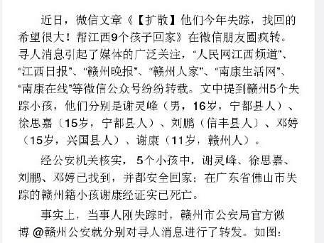 人民网北京5月28日电 据江西省赣州市公安局官方微博消息,近日,微信文章《【扩散】他们今年失踪,找回的希望很大!帮江西9个孩子回家》在微信朋友圈疯转。经公安机关核实, 5个小孩中,谢灵峰、徐思嘉、刘鹏、邓婷已找到,并都安全回家;在广东省佛山市失踪的赣州籍小孩谢康经证实已死亡。