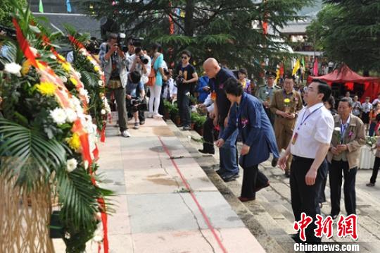 贺晓明(中)等老一辈革命家亲属代表向红军飞夺泸定桥纪念碑献花。 刘忠俊 摄