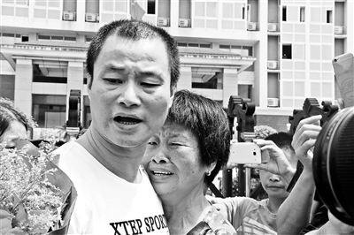 昨天上午10时许,林立峰、黄兴、陈夏影的家人等候在福州市榕城监狱门口。林立峰的母亲庄华英抱着林立峰的遗像呜呜地哭,“我儿子无罪释放了,我来迎接儿子回家”,林立峰的遗像被裱进镶着金边的相框,就装在她的包里。同其他两家亲属不同,庄华英等到的只有一份等待她签字的确认书。