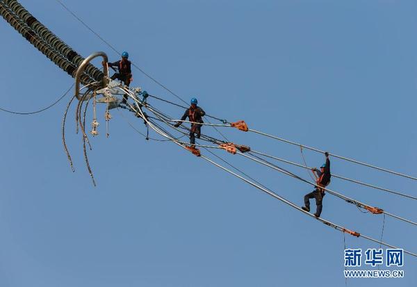 5月30日,施工人员在江苏省淮安市盱眙县王店乡境内的百米高空中作业。 在位于江苏中部的盱眙县“淮南-南京-上海”1000千伏特高压工程建设现场,有数百名施工人员在距地面百米左右的铁塔、线缆上作业,犹如特高压建设的“高空舞者”。 “淮南-南京-上海”1000千伏特高压工程全长759公里,是国家大气污染防治行动计划的重点输电通道之一,计划于2016年建成投运。 新华社发(周海军 摄)