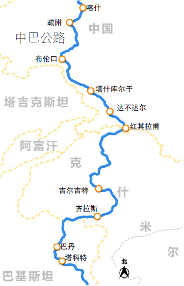 中巴公路北起中国新疆喀什,经疏附、乌帕、托海、布仑口、塔什库尔干、达不达尔、红其拉甫、水不浪沟,翻越喀喇昆仑山红其拉甫达坂进入巴基斯坦控制区,再经过巴勒提特、吉尔吉特、齐拉斯、巴丹、比沙姆到达巴基斯坦北部城市塔科特,全长1224公里。其中中国境内415公里,巴基斯坦境内809公里。