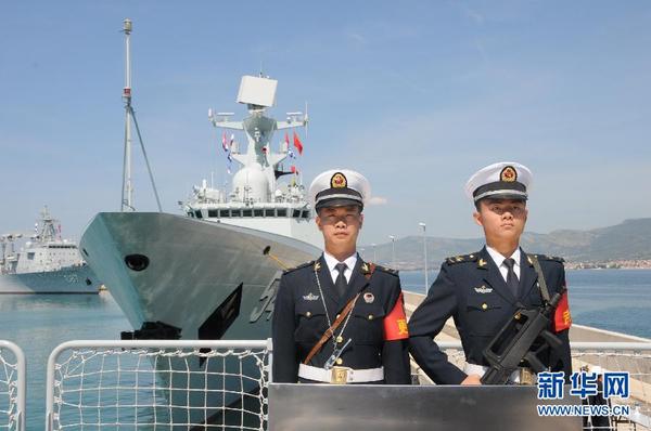 6月1日,在克罗地亚斯普利特的罗拉港,中国海军第十九批护航编队士兵在舰队周边护卫。当日,由导弹护卫舰临沂舰、潍坊舰和综合补给舰微山湖舰组成的中国海军第十九批护航编队抵达克罗地亚斯普利特市罗拉海军基地,开始对克罗地亚进行为期5天的友好访问。这是中国海军舰艇首次访问克罗地亚。新华社记者薛群摄