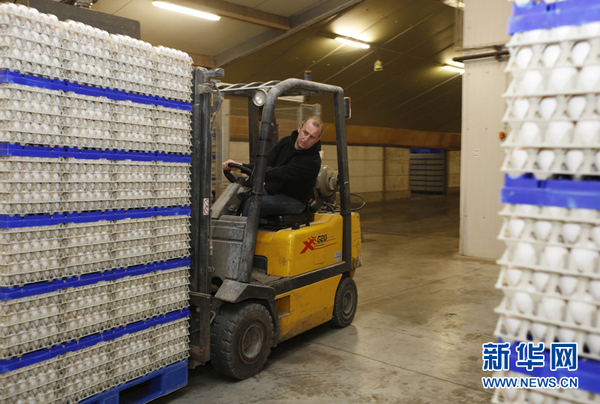 4月23日,比利时古城根特附近一个小村庄的养鸡场,阿尔贝斯·赫尔特驾驶叉车移走已经装箱的鸡蛋。新华社记者叶平凡摄