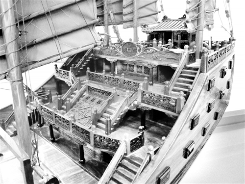 “这艘船就是大船缩小50倍的样子。你看,这些甲板都可以拿起来,下面就是隔舱。”刘细秀说,要做45米的大船,对我们工匠来说,也是一种挑战。他不光画了图,还先制作了小模型。
