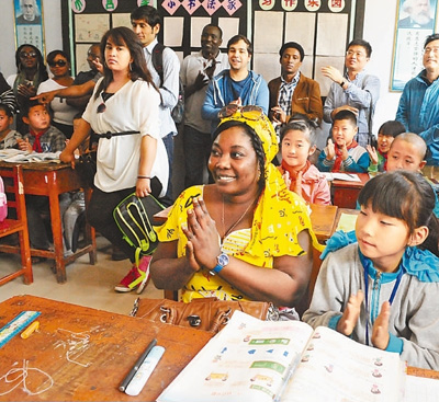 6月7日,吉林大学公共外交学院60多位来自亚洲、非洲和美洲的留学生来到吉林省农安县万金塔乡小城子小学,与该校师生进行交流联欢,向孩子们赠送书包和课外图书等,并带来精彩的英文课。据了解,吉林大学公共外交学院每年开展的“留学生进村小”活动受到各国留学生的积极响应,通过与农村孩子的互动交流,留学生们能够更加了解中国,同时也能让农村孩子们开阔眼界。图为留学生和孩子们唱歌互动。