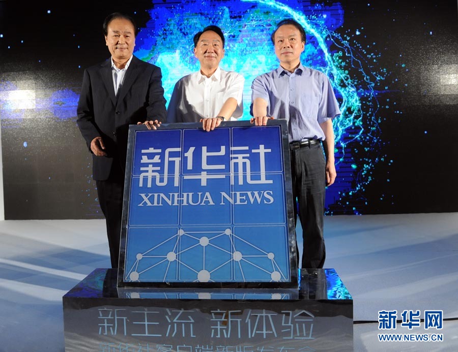 中宣部副部长、国务院新闻办公室主任蒋建国(中)、新华社社长蔡名照(左)、新华社总编辑何平(右)共同发布“新华社”客户端新版