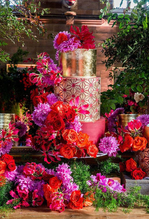 婚礼蛋糕由3个定做的蛋糕组成,每个上面都镶有金叶图案。(网页截图)