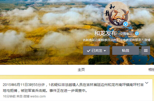 人民网北京6月11日电 据吉林省延边朝鲜族自治州和龙市委宣传部官方微博消息,2015年6月11日3时55分许,1名疑似非法越境人员在吉林省延边州和龙市南坪镇南坪村吉地屯拒捕,被驻军官兵击毙。事件正在进一步调查中。