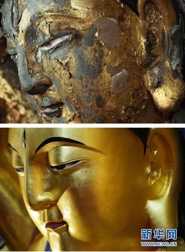 修复前后的重庆大足千手观音造像主尊特写(拼版照片,上图:2011年2月24日摄,下图:2015年3月31日摄)。 新华社发(罗国家 摄)