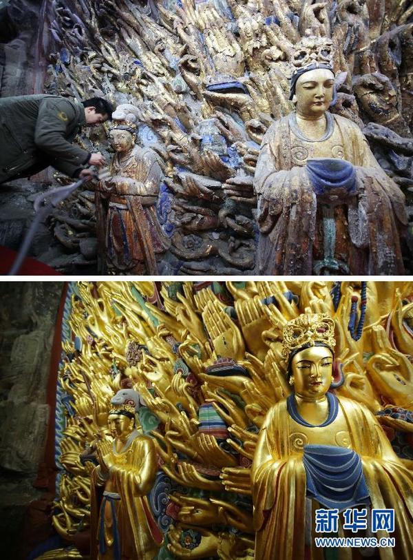 修复前后的重庆大足千手观音造像局部(拼版照片,上图:2011年2月24日摄,下图:2015年3月31日摄)。 新华社发(罗国家 摄)