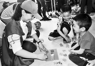 爱心志愿者陪孤儿院的孩子们做数学拼图游戏。王伟伟摄
