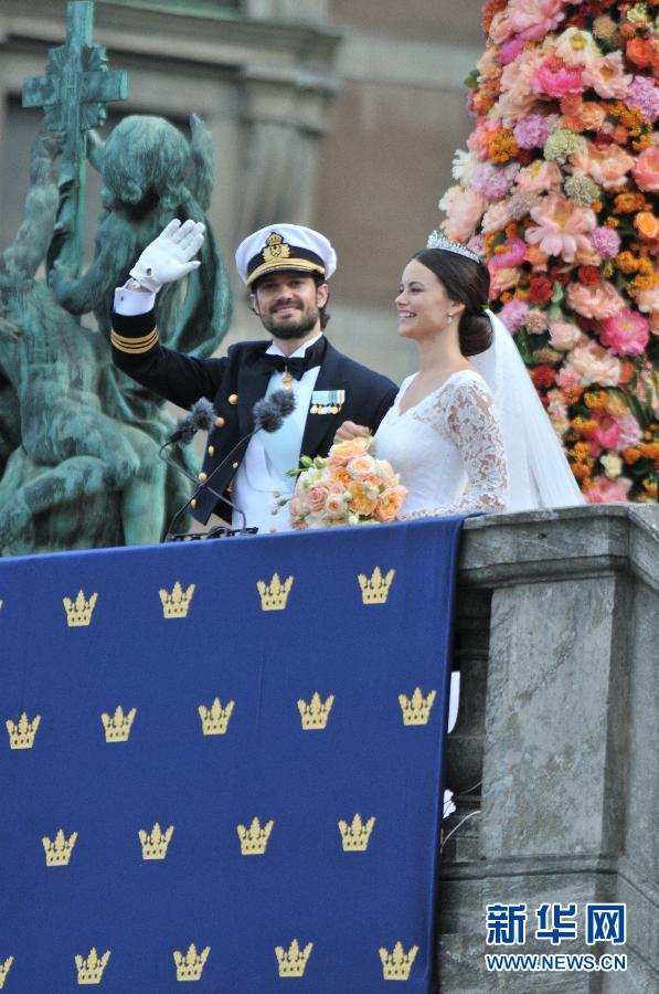 6月13日,在位于瑞典首都斯德哥尔摩市中心的瑞典王宫,瑞典国王卡尔十六世·古斯塔夫和西尔维娅王后出席菲利普王子的婚礼庆典。当日,瑞典王子卡尔·菲利普与索菲娅·赫尔奎斯特在斯德哥尔摩老城的王室教堂完婚。新华社发(罗布·顺巴姆摄)