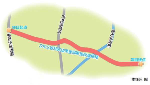 记者从现场了解到,改建工程起点位于新郑郭店镇S102与郑新快速通道相交处,向东利用现状S102加宽,由西向东,经京广铁路、薛店大道、石武高铁、京港澳高速、南水北调总干渠大桥、郑万高铁,止于蒿家与现状S102线交会处,路线全长24.4公里。其中港区段15.4公里,新郑段9公里。