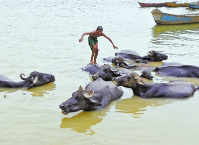 12日,在印度安拉阿巴德,一名男孩站在牛背上准备跳入亚穆纳河纳凉。当日,安拉阿巴德的气温达到42摄氏度。