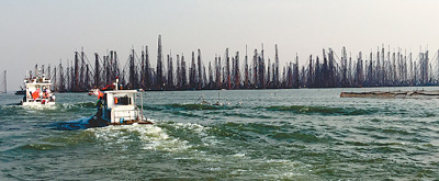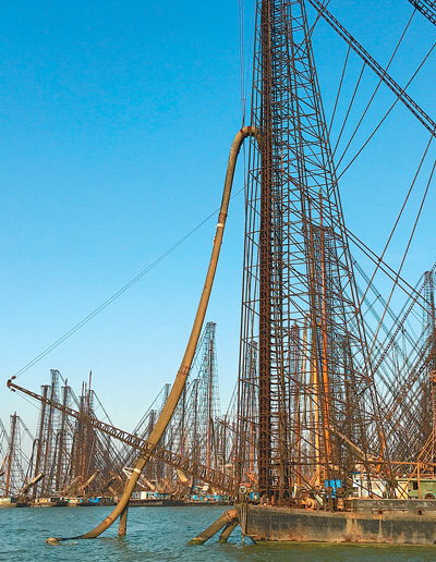 “桅杆越高,表明吸砂管道钻得越深,吸砂能力越强。”为记者开船的张师傅说,钻头深入到水下几十米,把地下的黄沙吸出,然后通过水洗,污水流回湖中,黄沙装进船里。“白天不让采砂,只有少数有‘保护伞’的敢采。”张师傅说。