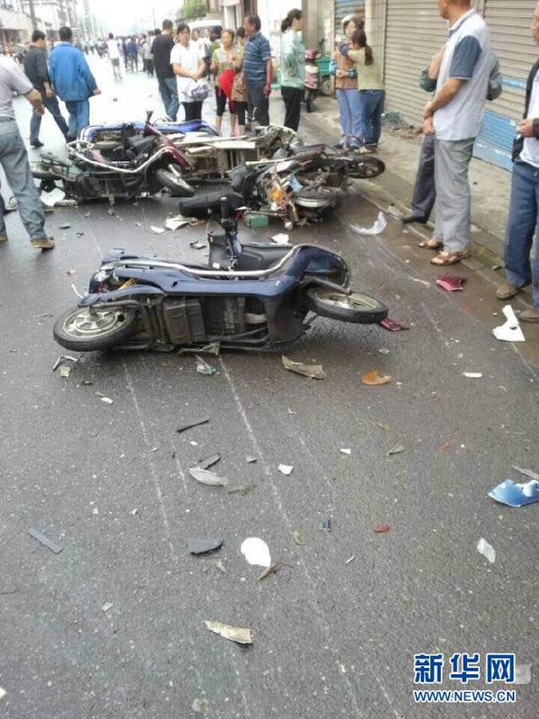 6月22日拍摄的车祸事故现场。据江苏省无锡市宣传部提供的通报,6月22日7时20分许,在滨湖区南湖路南泉裕村附近路段,一辆小汽车撞倒和带倒多辆电动车,造成10余人受伤,其中4名重伤人员经送医院抢救无效死亡。事故发生后,无锡市迅速调动相关各方力量对受伤人员进行全力救治。肇事者目前也已被公安机关控制,具体事故原因调查及后续处置工作还在进行中。新华社发