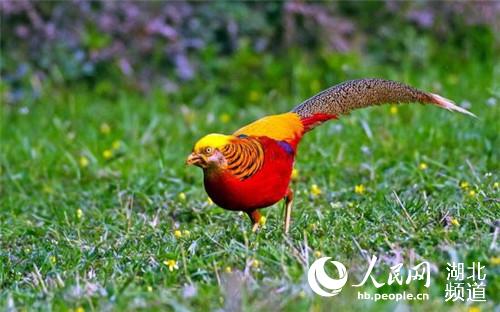 红腹锦鸡(学名:Chrysolophus pictus)又名金鸡,是国家二级保护动物,也是我国独有的珍稀物种,被很多人视为国鸟的有力竞争者。中型鸡类,体长59-110cm。尾特长,约38-42cm。雄鸟羽色华丽,头具金黄色丝状羽冠,上体除上背浓绿色外,其余为金黄色,后颈被有橙棕色而缀有黑边的扇状羽,形成披肩状。下体深红色,尾羽黑褐色,满缀以桂黄色斑点。雌鸟头顶和后颈黑褐色,其余体羽棕黄色,满缀以黑褐色虫蠢状斑和横斑。脚黄色。野外特征极明显,全身羽毛颜色互相衬托,赤橙黄绿青蓝紫具全,光彩夺目,是驰名中外的观赏鸟类。竹溪县的各地分布均有,而在湖北十八里长峡国家级自然保护区分布较为广泛。(王兆平)