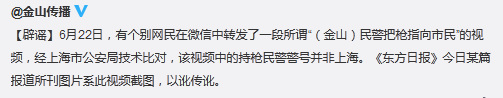人民网北京6月24日电 上海市金山区人民政府新闻办公室官方微博今日发布消息辟谣,6月22日,有个别网民在微信中转发了一段所谓“(金山)民警把枪指向市民”的视频,经上海市公安局技术比对,该视频中的持枪民警警号并非上海。
