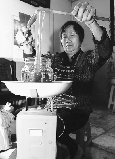 ②韩日花将麦芽糖称重装进玻璃罐保存。