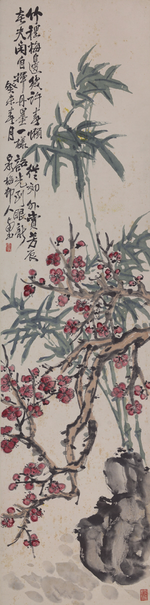 中国的文人墨客在花木草石中负载了自己的一片真情,使它们拓展了原有的意义。梅,探波傲雪,高洁志士;兰,深谷幽香,世上贤达;竹,清雅澹泊,谦谦君子;菊,凌霜飘逸,世外隐士。正是因为清雅淡泊的品质,梅兰竹菊为世人所钟爱,被称之为“四君子”,成为中国人借物喻志的象征,也是咏物诗文和艺人字画中常见的题材。辽宁美术馆馆藏赵云壑《竹梅图》立轴,纸本,设色,画心纵136厘米,横34厘米。该画创作于1943年,已近古稀之年的赵云壑此时笔墨已极老熟。画面下方太湖石略加勾染,淡墨敷色,布嶙峋。梅枝自右而出,盘虬怪屈,任意交错