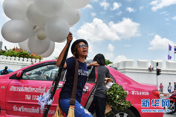 7月7日,在位于曼谷的泰国军事法庭前,一名支持者在得知14名被扣押大学生将被释放后准备乘坐出租车前往学生所在的曼谷押候监狱。新华网记者 李芒茫 摄
