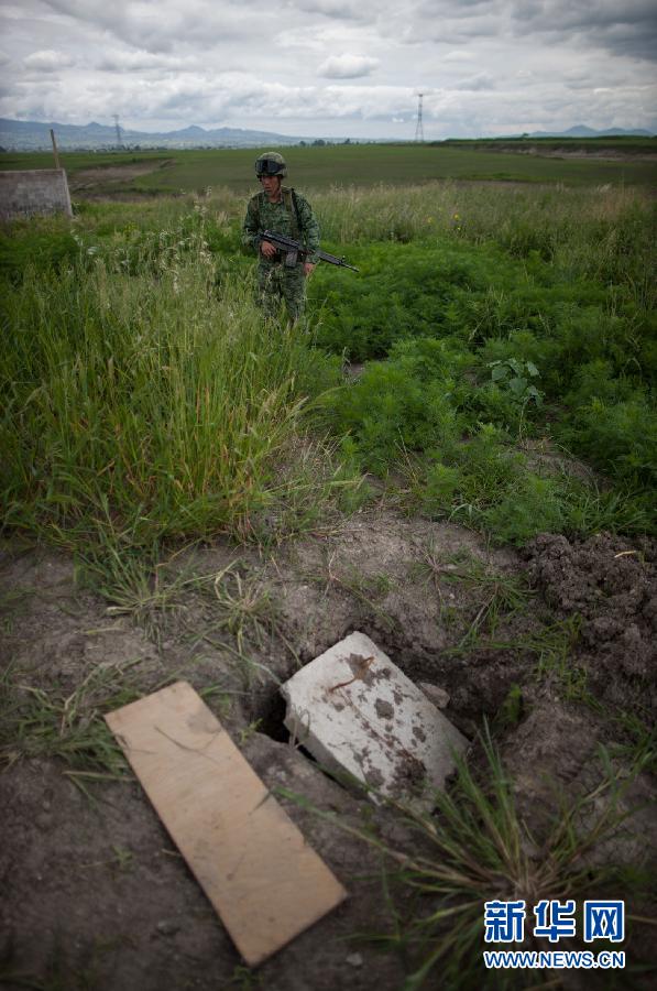 7月12日,在墨西哥阿尔莫洛亚-德华雷斯,一名士兵在毒枭华金·古斯曼·洛埃拉逃逸的疑似通道旁执勤。新华社发(佩德罗摄)
