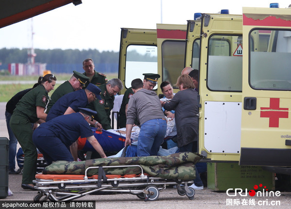 当地时间2015年7月13日,俄罗斯莫斯科,伊尔- 76战略运输机运送受伤士兵抵达莫斯科。据悉,俄罗斯第242空降部队训练中心的一幢营房12日晚坍塌,导致23人死亡,19名受伤官兵被送往医院接受治疗。图片来源:Sipa Photo