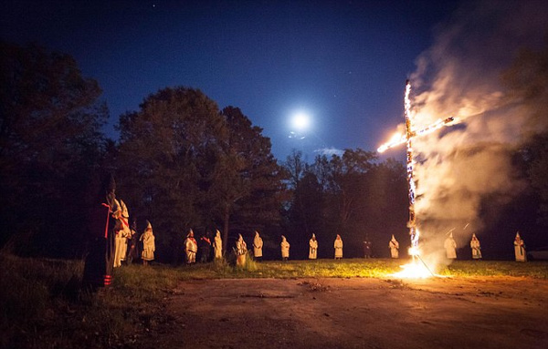 《每日邮报》网站公布的纪录片截图画面显示,几十名“传统美国骑士”的男女成员,身着传统三K党白袍,头套面罩,围在一个插在空地上的巨型木头十字架四周。十字架高9米,在黑夜里燃着熊熊烈火,伴随着成员们的吟唱……