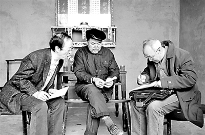 与吴氏秘传人交谈中。左一为李治亭,左二为吴永鹏,左三为滕绍箴。