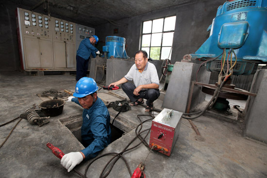 7月15日,维修人员帮助葛明宇(右)维修发电设备。