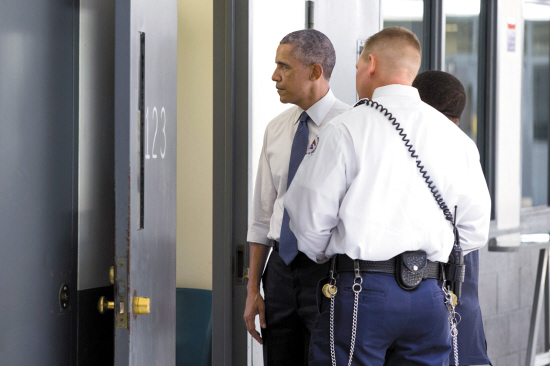 奥巴马先后与执法官员和6名涉毒囚犯见面并谈话。随后他来到一间被清空的普通牢舍,查看犯人的饮食起居用品。