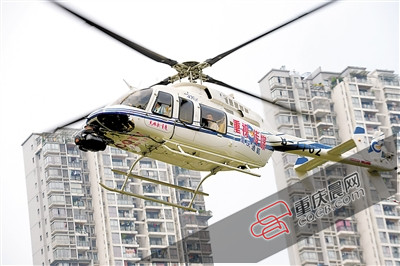 昨日,用于2015年版《鸟瞰新重庆》拍摄的直升机在九龙坡天宝实验学校起飞。 重庆晨报记者 胡杰 摄