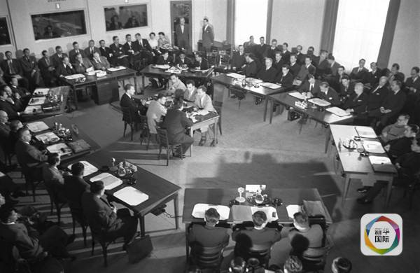 日内瓦会议讨论关于恢复印度支那和平问题会议的会场全景,图注中使用了“寮国”,1954年5月18日发,新华社记者刘东鳌摄。