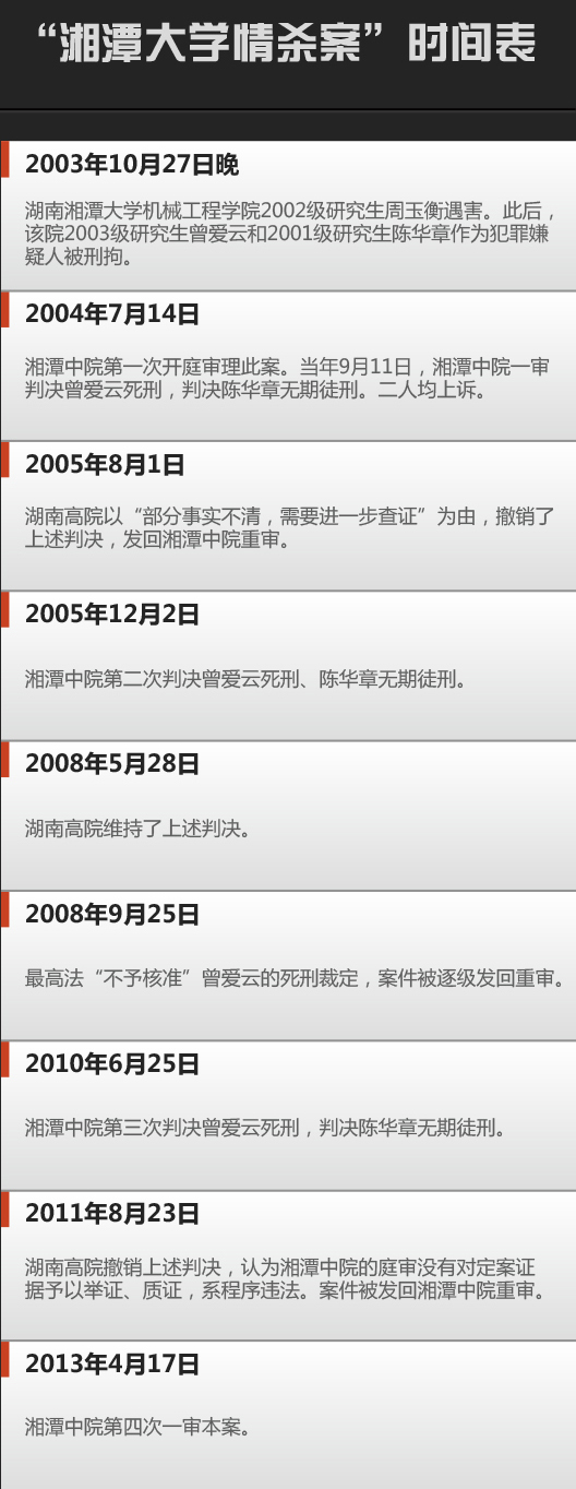 澎湃新闻曾多次报道,2003年10月27日晚,湘潭大学机械工程学院一值夜班教师因厕所没灯,欲在草地上方便时,发现了一具尸体,经证实为该院2002级硕士生周玉衡。几天后,该院2003级硕士生曾爱云、2001级硕士生陈华章作为合谋杀害周的嫌疑人被羁押。