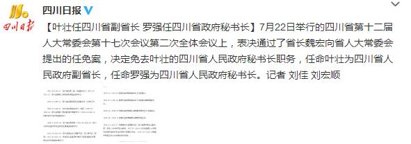 人民网北京7月22日电 据四川日报官方微博消息,7月22日举行的四川省第十二届人大常委会第十七次会议第二次全体会议上,表决通过了省长魏宏向省人大常委会提出的任免案,决定免去叶壮的四川省人民政府秘书长职务,任命叶壮为四川省人民政府副省长,任命罗强为四川省人民政府秘书长。