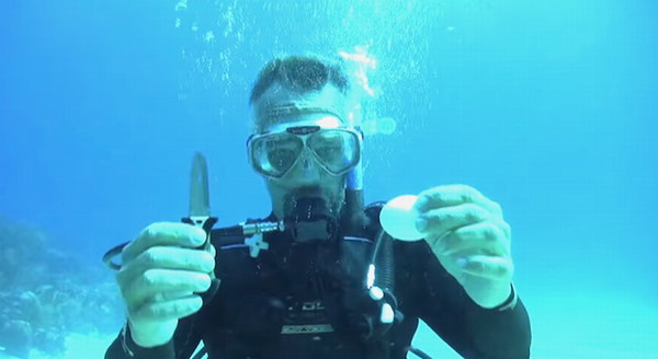 潜水员用一把小刀打开鸡蛋(网页截图)