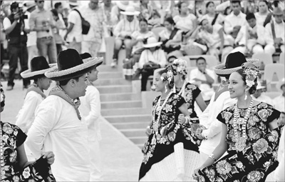 从7月20日起,为期两周,墨西哥瓦哈卡市的印第安人热烈庆祝盖拉盖查节,这一传统节日源自印第安人敬拜玉米女神的活动,成为一个追忆历史、展现印第安部落文化、分享部落间土特产的大型庆典。图为印第安青年在瓦哈卡市郊的弗尔丁山上载歌载舞。