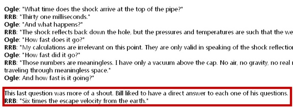 至于布朗利对其速度的估计,是因为在核爆炸后,他的上司向他提出一系列问题,而这名上司的性格是偏好直截了当的答案,当时又是大吼着问他井盖的速度,在这种压力下,他只好说了一个估计的数值:“大约6倍地球逃逸速度。”