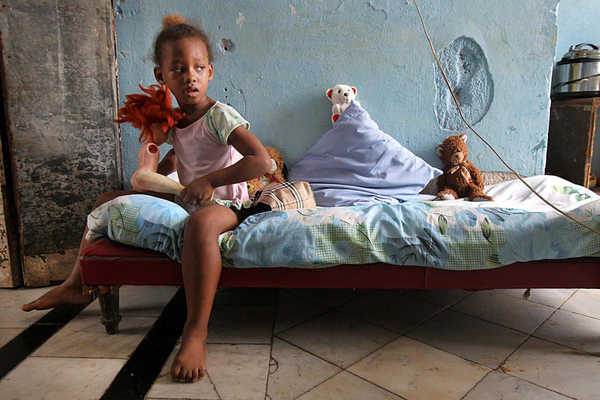 4岁的埃莉娜妮·迪亚兹曾两次掉下旅馆地板的洞中,目前正等待视觉神经手术。(网页截图)