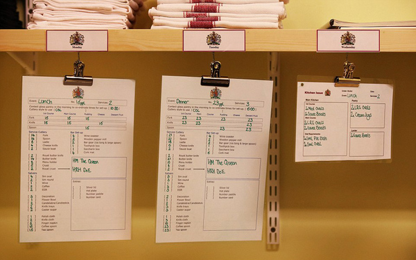 英国女王伊丽莎白二世至今已主持过110场白金汉宫的国宴。而准备国宴也是一件非常复杂繁琐的工程,大约要花费10天的时间。整场国宴约有170桌,餐桌上摆放的每套餐具之间必须精确相差46厘米。整场国宴要用去1104个玻璃杯,每位客人可拥有一套6件玻璃杯,分别用于饮用水、香槟、红酒、白酒等。国宴一般由4道菜组成,分别是前菜、肉类菜肴、甜点,以及水果。