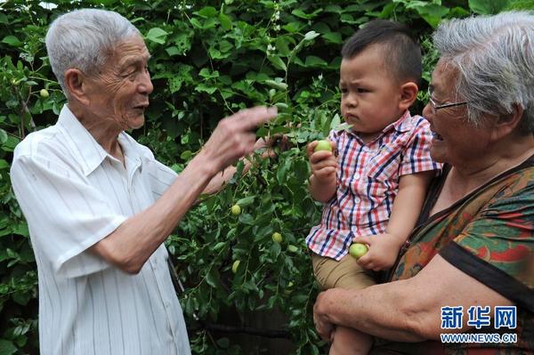 7月26日,王明才(左)和老伴何秀娟在浙江义乌自家院子里与1岁的曾外孙玩耍。新华社记者谭进摄