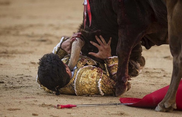 西班牙斗牛士被牛角挑到空中刺中脖子 满脸鲜血 (高清组图)