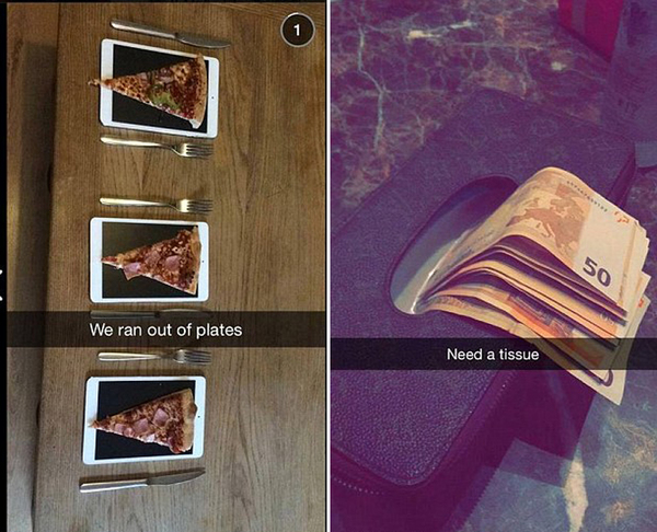 许多照片显示,富家子弟们以非常规方式利用他们的奢华设备。左侧照片显示,披萨被放在iPad上,旁白写着“我们用光了盘子”。右图中,一名富家子用50欧元纸币充当棉纸。(网页截图)