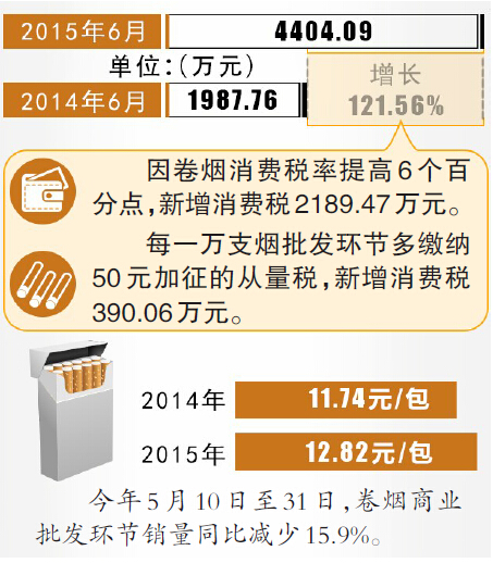 昨日,记者从乌市国税局获悉,5月10日起,卷烟批发环节消费税税率由5%提高至11%,并在批发环节加征0.005元/支的从量消费税。从6月份首个整月税款征收期看,2015年6月征收消费税4404.09万元,较上年同期增收2416.33万元,增长121.56%。其中,因卷烟消费税率提高6个百分点,新增消费税2189.47万元;而每1万支烟批发环节多缴纳50元加征的从量税,新增消费税390.06万元。