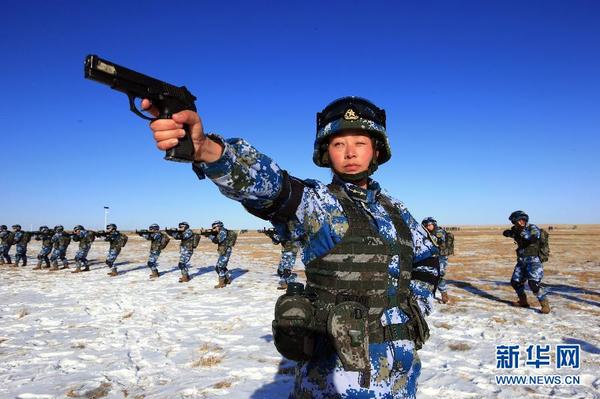 海军女陆战队员在塞北寒区进行站姿射击训练( 2014年2月27日摄)。