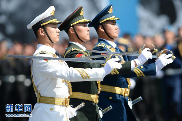 2015年5月11日,在俄罗斯新罗西斯克举行的中俄“海上联合—2015(Ⅰ)”军事演习开始仪式上,中国海军导弹护卫舰临沂舰整装待发。中俄“海上联合-2015(Ⅰ)”军事演习当地时间5月11日上午在俄罗斯新罗西斯克市拉开帷幕。张选杰 摄