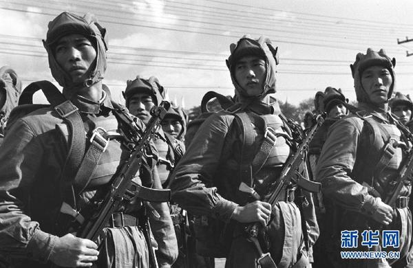 这是1953年国庆阅兵式上的中国人民解放军伞兵部队。 新华社记者许颖摄(资料照片)