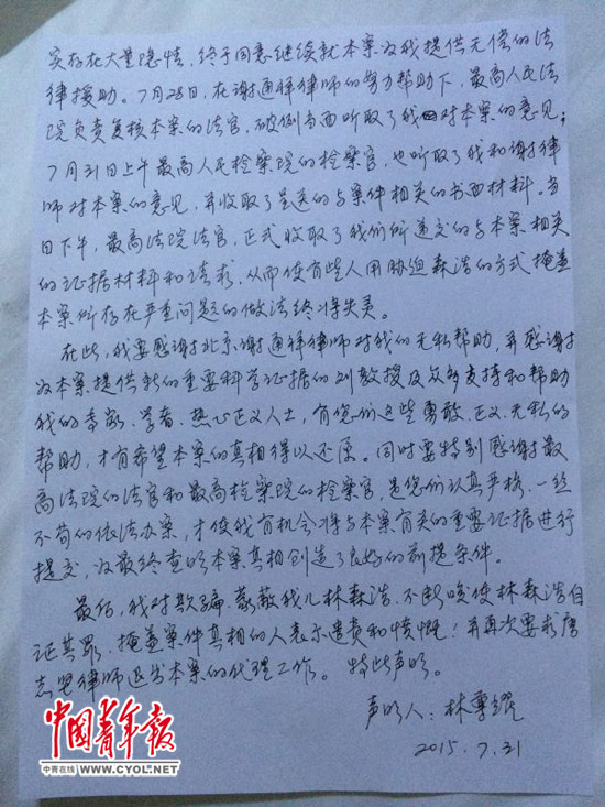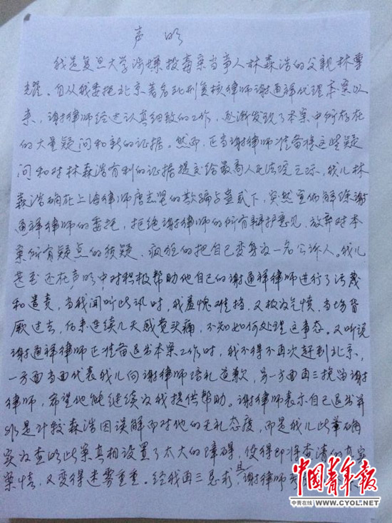 林森浩父亲声明